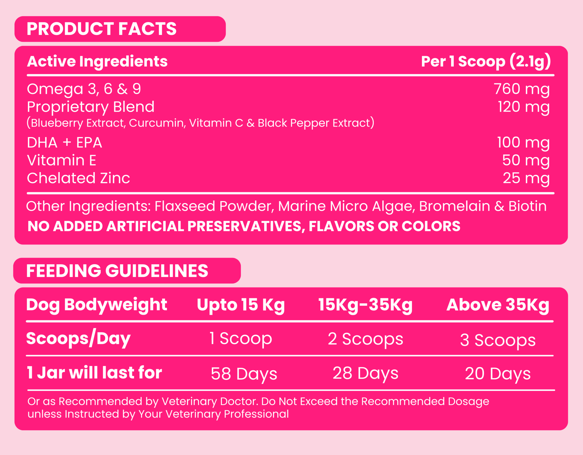 Give your dog the ultimate glow with our Skin & Coat Supplement, packed with nature’s finest ingredients to promote healthy skin and a shiny coat. Flaxseeds deliver Omega-3 fatty acids to reduce dryness and itching, while DHA and EPA support a silky, smooth coat. Biotin, Vitamin E, and Vitamin C work together to nourish the skin, strengthen hair follicles, and reduce shedding. Zinc supports overall coat health, and the addition of antioxidant-rich blueberry extract helps combat free radicals, keeping your dog’s skin vibrant and healthy. With every scoop, your furry friend gets a boost of nutrients for a radiant coat and happy skin!